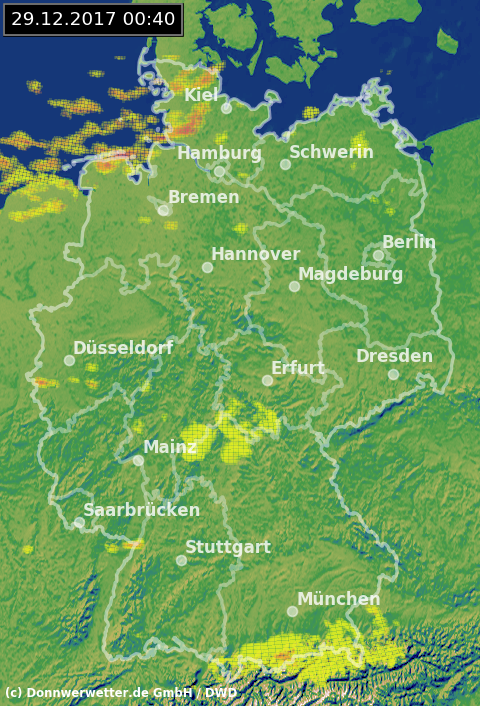 Das Radarbild zeigt aktuell an den Alpen und über der Mitte noch einige leichtere Signale mit Schneefall. Im Nordseeumfeld erkennt man stärkere Schauersignale. Sonst ist der Himmel über Deutschland häufig wolkenverhangen, teilweise aber auch aufgeklart. Vereinzelt haben sich Nebelfelder gebildet.