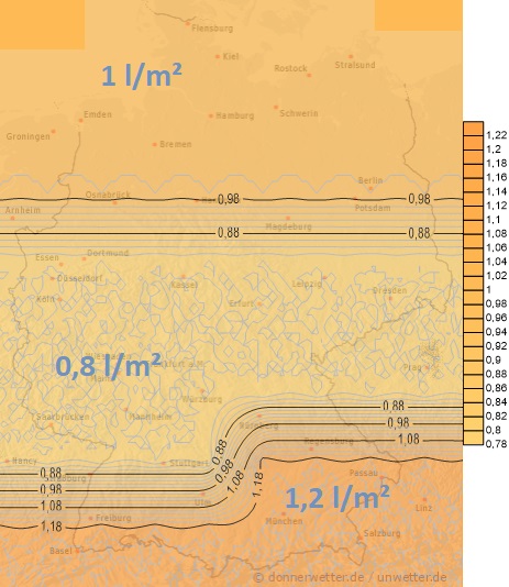 Heute regnet es in einem Streifen von der Saar bis nach Brandenburg. Dabei sind Mengen zwischen 5 und 15 Liter pro Quadratmeter zu erwarten. Diese sollten aber auf den hochwassergeplagten Rhein und seine Nebenflüsse keine allzu großen Auswirkungen mehr haben.