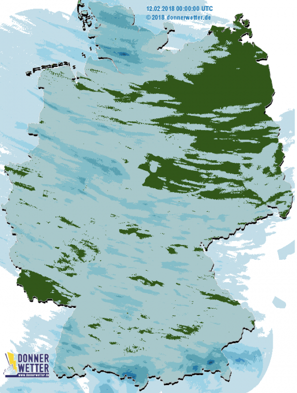 Am Donnerstag zieht von Westen neuer Niederschlag auf, dabei fällt anfangs Schnee oder auch gefrierender Regen, anschließend bei leichter Milderung Regen. Die Niederschlagsmengen liegen meist zwischen 1 und 10 Liter pro Quadratmeter. Ganz im Osten bleibt es zunächst noch trocken.