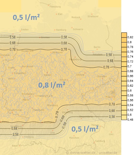 Von Montag auf Dienstag zieht ein Regengebiet von Norddeutschland Richtung Süden. Dabei sind Mengen zwischen 5 und 10 Liter pro Quadratmeter zu erwarten.