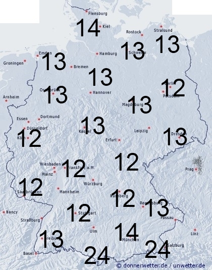 Von Norden ziehen im Tagesverlauf Niederschläge auf, die in den Bergen als Schnee, sonst aber als Regen fallen. Außerdem entsteht Benetzung durch Feuchtigkeit. Die Benetzungsdauer liegt dabei allgemein zwischen 12 und 14 Stunden, kann aber außerhalb von Ortschaften in geschützten Lagen noch deutlich nach oben abweichen. In den Bergen werden bei einer Schneedecke 24 Stunden erreicht.