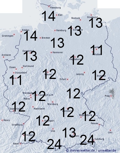 Gegen Abend zieht von der Nordsee her leichter Regen in den Nordwesten. Sonst entsteht Benetzung durch Feuchtigkeit wie Tau- und Reifansatz. Die Benetzungsdauer liegt dabei meist zwischen 11 und 14 Stunden. Bei einer vorhandenen Schneedecke in höheren Lagen werden bis 24 Stunden erreicht.