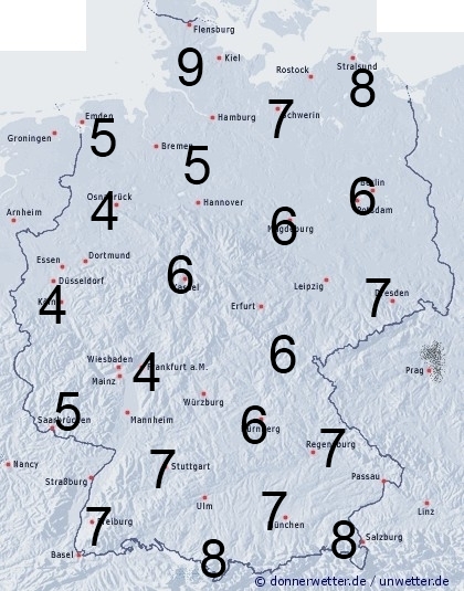 An den Küsten und in Schleswig-Holstein fällt zunächst noch gelegentlich leichter Regen oder Sprühregen. Sonst entsteht Benetzung durch Feuchtigkeit, sowie Taubildung. Die Benetzungsdauer liegt allgemein zwischen 4 und 9 Stunden, kann jedoch in windgeschützten Lagen außerhalb von Ortschaften deutlich nach oben abweichen.