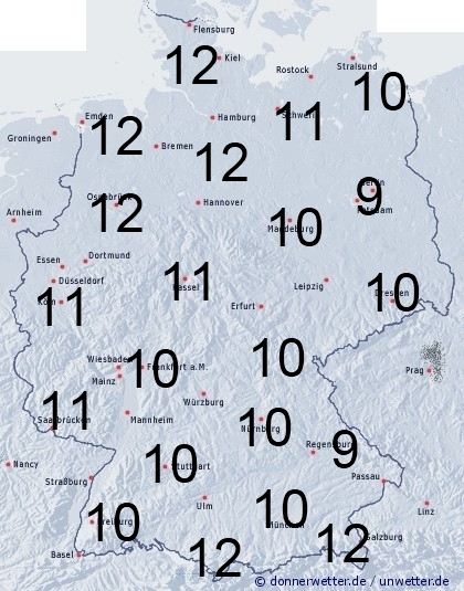 Im Nordwesten und Westen kann es gelegentlich regnen. Dieser Regen kommt im Tagesverlauf auch bis in die Landesmitte voran. Sonst entsteht Benetzung durch Feuchtigkeit und Tau. Die Benetzungsdauer liegt allgemein in Deutschland zwischen 9 und 12 Stunden, kann jedoch außerhalb von Ortschaften in geschützten freien Lagen deutlich nach oben abweichen.