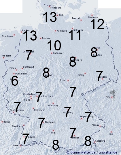 Im Norden und Nordosten fällt gelegentlich Regen oder Sprühregen. Dabei liegt die Benetzungsdauer zwischen 8 bis 13 Stunden. Sonst werden in Deutschland durch Tau allgemein 6 bis 8 Stunden erreicht.