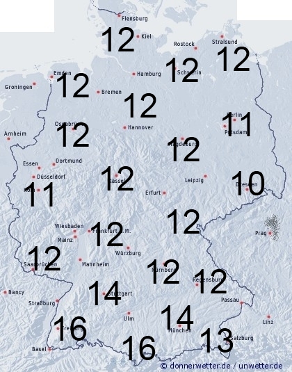 Von West nach Ost zieht allmählich ein Regengebiet über Deutschland hinweg und sorgt für Benetzung. Die Benetzungsdauer liegt dabei allgemein zwischen 11 und 16 Stunden. Nachts entsteht vor und nach dem Regen auch Benetzung durch Tau.