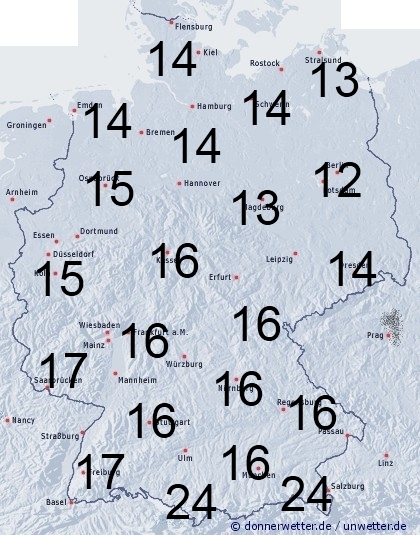Unter Zufuhr milderer Luft fällt in Deutschland verbreitet Regen, lediglich im Nordosten bleibt es zunächst noch für längere Zeit trocken. Nur im höheren Bergland fällt noch Schnee. Die Benetzungsdauer liegt allgemein zwischen 12 und 17 Stunden. Bei einer vorhandenen Schneedecke können bis zu 24 Stunden erreicht werden.