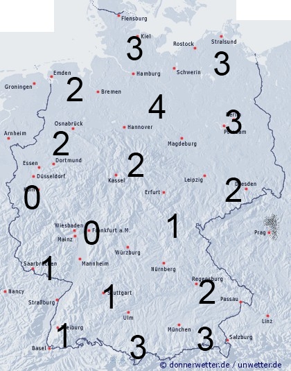 In der Nordhälfte können bei auftretenden Schauern zwischen 2 und 4 Stunden Benetzung erreicht werden. Sonst entsteht meist nur durch nächtlichen Strahlungstau leichte Benetzung.