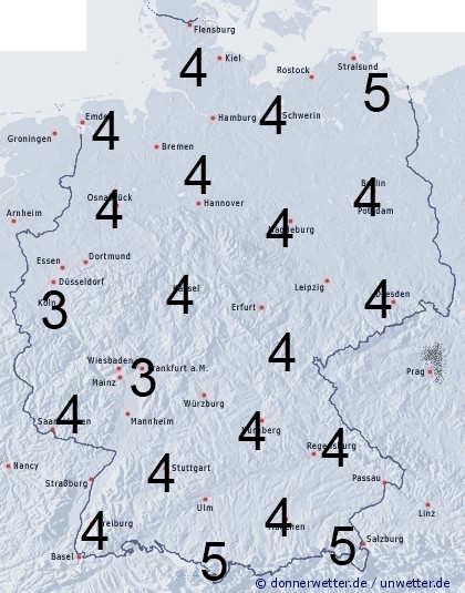 In Deutschland bleibt es größtenteils niederschlagsfrei. Lediglich an der Oder zieht im Tagesverlauf Regen auf. Sonst entsteht Benetzung durch Feuchtigkeit wie Tau- oder Reifansatz. Die Benetzungsdauer liegt allgemein zwischen 3 und 5 Stunden, kann jedoch außerhalb von Ortschaften in geschützten Gebieten nach oben abweichen. Bei einer noch vorhandenen Schneedecke in den Bergen werden bis zu 24 Stunden erreicht.