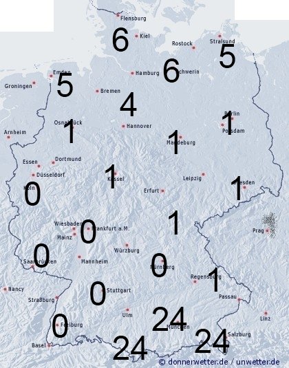 Im Norden kann es gebietsweise schneien oder zu Schneeschauern kommen. Sonst sorgt der trockene und eisige Nordostwind kaum für Benetzung. Die Benetzungsdauer liegt in Deutschland allgemein zwischen 0 und einer Stunde, im Norden gebietsweise zwischen 4 und 6 Stunden. Bei einer vorhandenen Schneedecke in den Bergen und in Teilen Bayerns und Baden-Württembergs werden bis zu 24 Stunden erreicht.