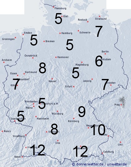 Die Benetzungsdauer liegt bei gelegentlich auftretenden Niederschlägen deutschlandweit zwischen 5 und 12 Stunden. Bei einer vorhandenen Schneedecke in den Bergen werden 24 Stunden erreicht.