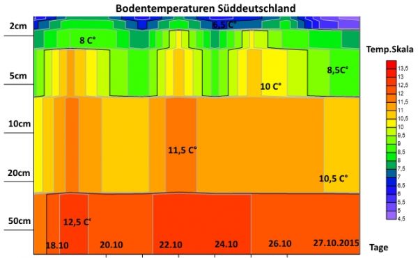 Bodentemperaturen vom 18.10.2015 bis zum 27.10.2015, für den Süden Deutschlands.