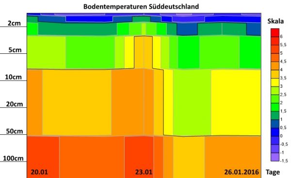 Bodentemperaturen vom 20.01.2016 bis zum 26.01.2016, für den Süden Deutschlands.
