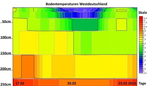 Bodentemperaturen vom 28.01.2016 bis zum 23.02.2016, für den Westen Deutschlands.