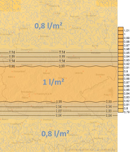 Am Sonntag und Montag kommt es zu teils schauerartigen Niederschlägen. Die Schneefallgrenze sinkt wahrscheinlich gebietsweise auf 400 bis 700 m. Im Süden Deutschlands regnet es am Sonntag für längere Zeit. In der Nacht auf Montag geht der Regen bis in tiefere Lagen in Schnee über und führt zu winterlichen Straßenverhältnissen. Hier können an beiden Tagen insgesamt über 50 Liter Niederschlag pro Quadratmeter fallen. Im Nordosten bleibt es am Montag vermutlich trocken.
