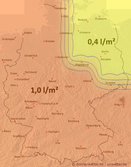 Am Dienstag und Mittwoch können einige Schauerwolken über die Mitte und den Norden ziehen. Dabei sind Regenmengen zwischen 2 und 5 Liter / m² möglich. Im Süden bleibt es wahrscheinlich bis auf wenige Ausnahmen trocken.