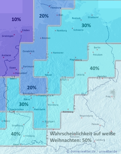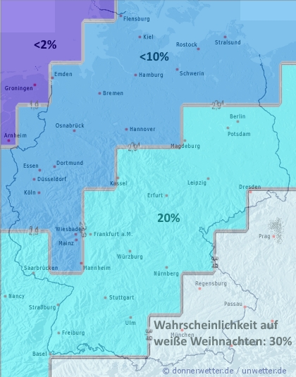 Dabei ist ein weißes Weihnachtsfest in den meisten Regionen Deutschlands eher die Ausnahme als die Regel: In Norddeutschland liegt nur in jedem sechsten Jahr an mindestens einem der Feiertage Schnee, im Westen sogar nur in jedem zehnten Jahr. Im Süden ist es immerhin in jedem zweiten bis dritten Jahr weiß.
