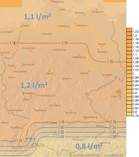 Am Dienstag zieht im Tagesverlauf von Westen ein umfangreicheres Regengebiet ins Land. Die Mengen liegen dabei meist zwischen 5 und 15 Liter pro Quadratmeter.