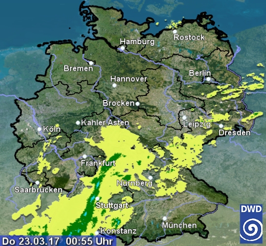 Das Radarbild zeigt zwar von Baden-Württemberg, über die Mitte, bis in den Osten hinein leichte bis mäßige Niederschlagssignale. Regen fällt jedoch derzeit nur örtlich etwas.