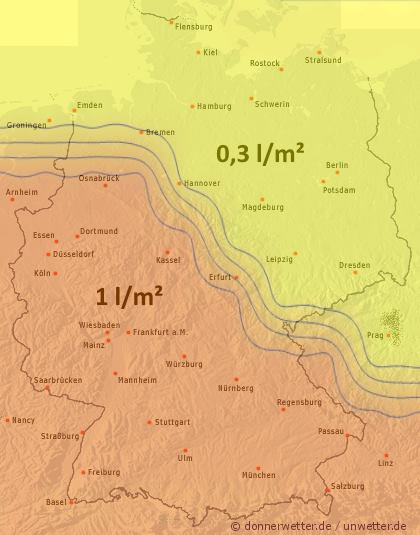 Diese scheinbar etwas intensivere Zone über Baden-Württemberg, wandert allmählich über die Mitte in den Nordosten. Daher kann es bis morgen Nachmittag gebietsweise etwas tröpfeln, oder leichten Regen geben. Mehr als 2 bis 4 Liter / m² sollten dabei aber nicht zusammen kommen.