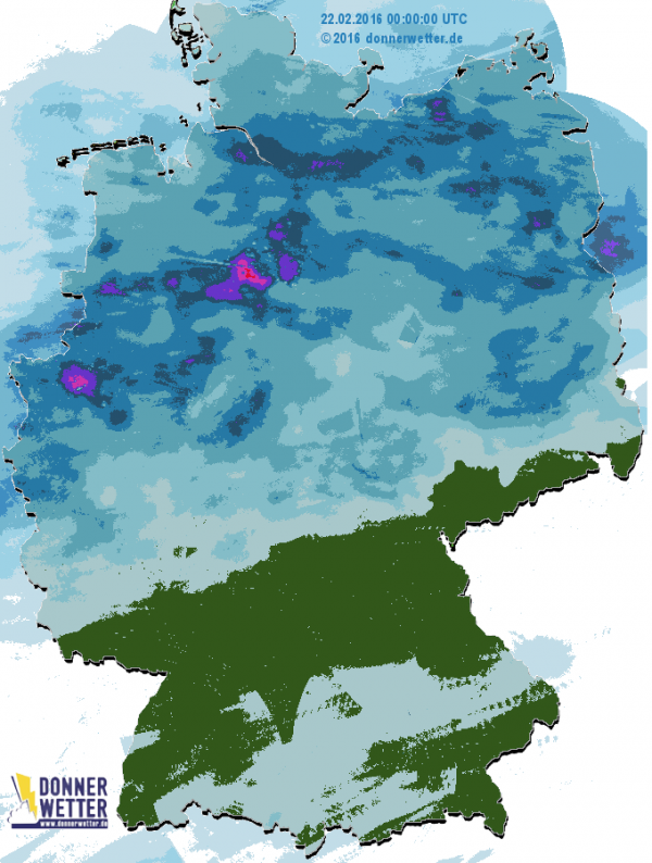 Nördlich der Mittelgebirge brachte die Kaltfront viel Regen und Schnee. Bis zu 20 l/m2 Regen fielen im Flachland. Heute regnet es im Süden und in der Mitte.