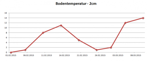 Unsere Bodentemperaturprognose (-2 cm, 14 Uhr) für Freiburg im Breisgau bis Mitte März: