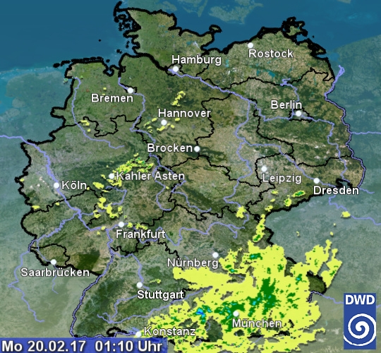 Das Radarbild von Deutschland zeigt momentan leichte bis mäßige Echos über Bayern. Hier fällt Regen, Sprühregen und in höheren Lagen des Bayrischen-Waldes, sowie an den Alpen auch Schnee. Achtung, auf dem noch kalten Boden besteht stellenweise die Gefahr von Glatteisbildung. Das Niederschlagsgebiet wird sich bis zum Morgen nach Österreich entfernen.