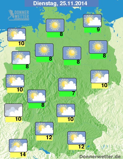 Der Dienstag wird wieder verbreitet freundlich und trocken. Im Südwesten ziehen jedoch immer wieder teils dichte Wolken auf, dabei bleibt es aber weitgehend trocken. Sonst ist es verbreitet heiter, vor allem im Norden auch oft sonnig und es bleibt trocken. Die Temperatur steigt auf 8 bis 14 Grad.