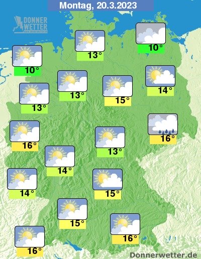 Am Montag zeigt sich der Süden oft heiter, teils halten sich hier auch einige Wolken. Im übrigen Land ist es meist stark, hier und da etwas aufgelockert bewölkt, dabei bilden sich nur selten Schauer. Die Temperatur steigt auf 10 Grad in Rostock und bis 16 Grad in München.