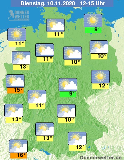 Am frühen Nachmittag gibt es meist ein Wechselspiel aus Sonne und Wolken. An den Küsten von Nord- und Ostsee strahlt die Sonne auch für längere Zeit vom heiteren Himmel. Regional halten sich aber auch zähe Nebel- oder Hochnebelfelder.
