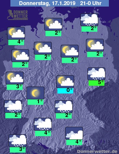 Während der zweiten Nachtälfte regnet oder schneit es dann nur noch im äußersten Nordosten, sowie am Alpenrand. Sonst zeigen sich verbreitet Mond und Sterne.