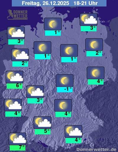 Heute Abend zeigt sich der Himmel über der Südwesthälfte des Landes meist locker bewölkt, teils auch sternenklar. Im übrigen Bundesgebiet ist es überwiegend nur sternenklar. Es bleibt überall trocken bei Werten von 7 Grad in Freiburg und bis -1 Grad in Erfurt.