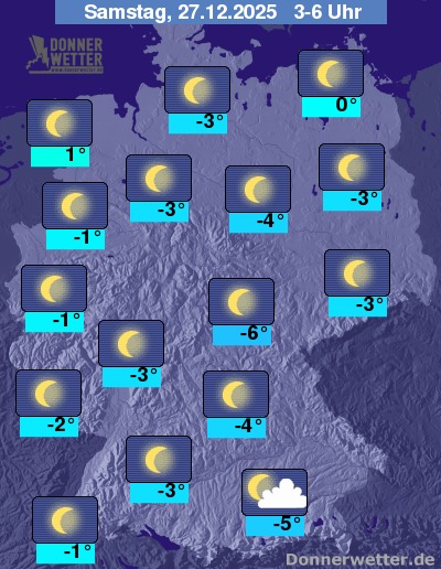In der Nacht zum Samstag ist der Himmel praktisch über dem ganzen Bundesgebiet sternenklar. Es bleibt landesweit trocken bei Tiefstwerten von 1 Grad an der Nordsee und bis -6 Grad im Eichsfeld.