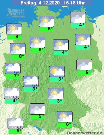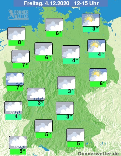 Die Temperaturen bewegen sich zwischen 3 und 8 Grad, am mildesten wird es am Niederrhein und an der Ems.