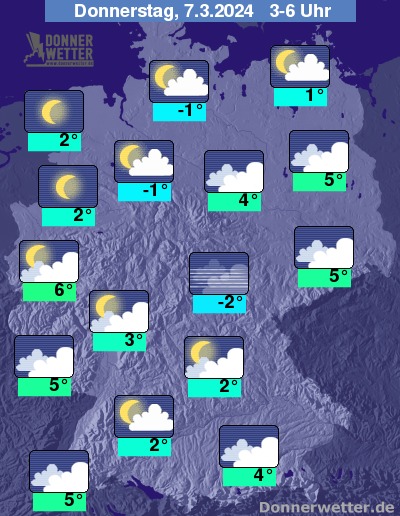 In der Nacht auf Donnerstag setzen sich Regen- und Schneefälle im Süden anfangs noch fort, im weiteren Verlauf nachlassend. Sonst bleibt es bei teils wolkigem, teils nur gering bewölktem Himmel weitgehend niederschlagsfrei. Lokal kann sich Nebel bilden.