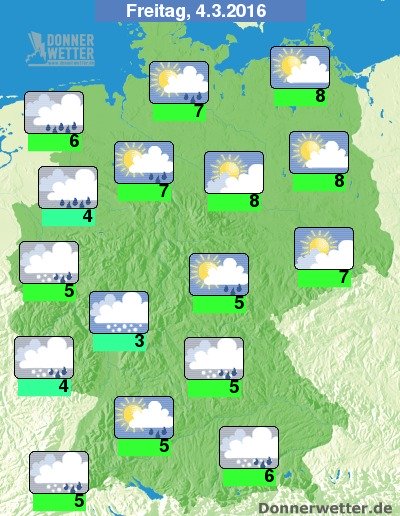 Am Freitag ist es zunächst zumeist leicht bis aufgelockert bewölkt und dazu trocken, von Südwesten ziehen jedoch schon rasch dichte Wolken mit zeitweiligem Regen, zum Teil auch Schneeregen oder Schnee auf. Im Norden und Osten nimmt die Bewölkung zwar immer weiter zu, hier bleibt es bis zum Abend jedoch meist trocken. Die Temperatur steigt auf 3 Grad am Westerwald und bis etwa 8 Grad im südlichen Brandenburg.