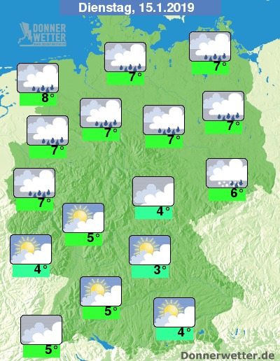 Am Dienstag ist es im Süden und Westen teils aufgelockert, teils stark bewölkt, aber weitgehend trocken. Über der Nordosthälfte hält sich dagegen meist dichte Bewölkung und es fällt wiederholt Regen. Die Temperatur steigt auf 3 bis 8 Grad.