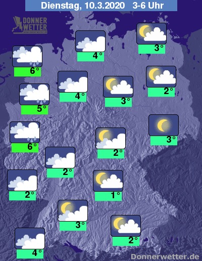 Der Dienstag startet in der Westhälfte mit einer meist geschlossenen Wolkendecke, aus der in den Frühstunden immer wieder Regen, in höheren Lagen auch Schneeregen oder Schnee fallen kann. Im Osten und Südosten wechseln sich Sonne und Wolken in den Morgenstunden ab und es bleibt meist trocken.