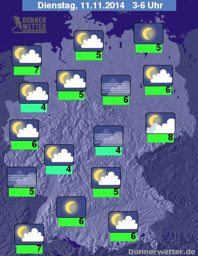 In der kommenden Nacht lockern auch die Wolken im Osten und Süden oft auf und es bleibt weitgehend trocken. Im Norden und Westen ist es meist locker bewölkt, zeitweise auch sternenklar und es bleibt ebenfalls trocken. Hier und da kann sich Nebel oder Hochnebel bilden. Die Temperatur sinkt auf 8 Grad in Görlitz und 4 Grad im Westerwald.