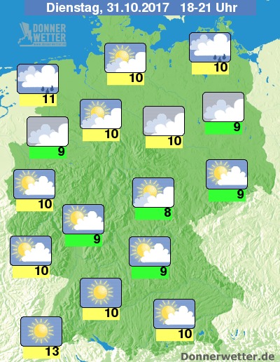 Heute Abend zeigt sich der Norden stark bewölkt und vor allem in Küstennähe fällt auch zeitweise Regen. Über der breiten Landesmitte ist es wechselnd bewölkt, oft auch heiter. Im Süden ist es mehrheitlich heiter bis sonnig. Es bleibt trocken bei 8 bis 13 Grad.