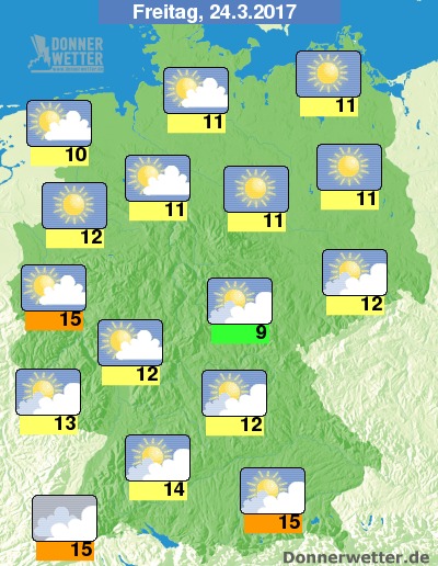 Der Freitag beschert vor allem der Nordhälfte strahlenden Sonnenschein, während sich im Süden Sonne und Wolken abwechseln. Die Höchstwerte liegen dann zwischen 10 und 15 Grad.