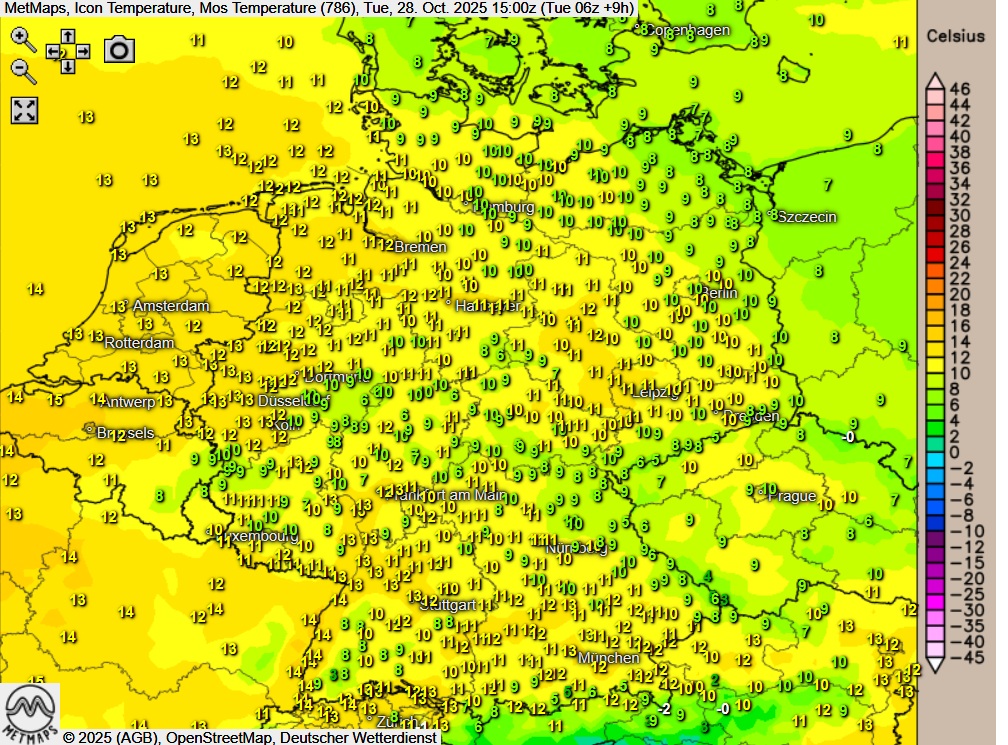 Die Böen- und Temperaturkarte für Dienstagnachmittag (15:00 Uhr) nach ICON: