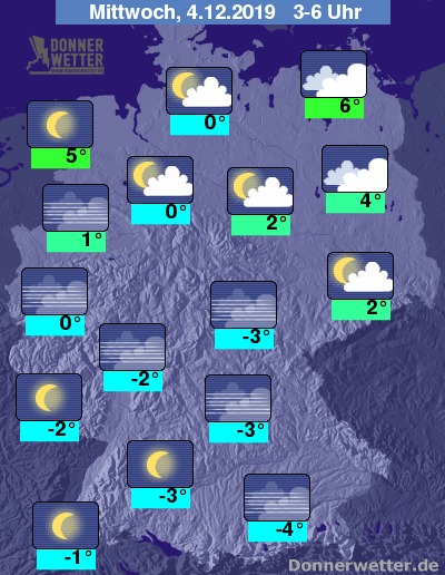Bis zu den Frühstunden kühlt die Luft in der Mitte und im Süden auf frostige -5 bis 0 Grad ab und es kann zu überfrierender Nässe oder Reifglätte kommen. Im Norden gibt es nur örtlich leichten Frost. Am mildesten bleibt es mit 5 bis 6 Grad an den Küsten von Nord- und Ostsee.