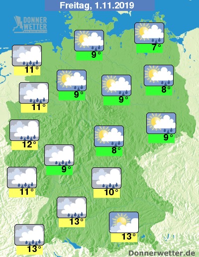 An Allerheiligen ist es im Westen und Süden des Landes bedeckt und es wird nass. In der Mitte des Landes und im Osten zeigt sich hingegen ab und zu die Sonne. Aber auch hier kommt es immer mal wieder zu Schauern. Die Temperaturen liegen zwischen milden 7 Grad an der Ostsee und bis zu 13 Grad in Süddeutschland.