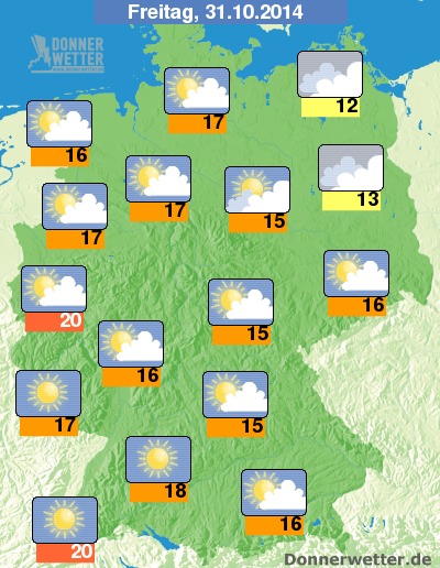 Im sonnigen Südwesten sowie im Rheinland sind an diesem letzten Oktobertag regionale Höchstwerte um 20 Grad C möglich.