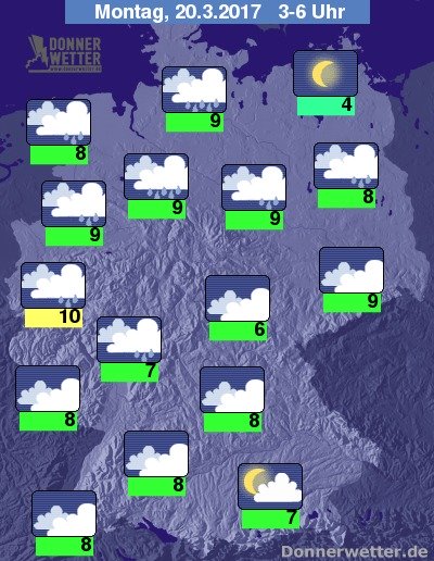 In der Nacht zum Montag klart der Himmel über dem Nordosten Deutschlands auf, hier bleibt es trocken. Über der übrigen Nordhälfte ziehen jedoch dichte Wolken mit zeitweiligem Regen hinweg. Im Süden ist es zwar meist stark bewölkt, jedoch auch weitgehend trocken. Die Temperatur sinkt auf 10 Grad in Bonn und bis 4 Grad an der Müritz.