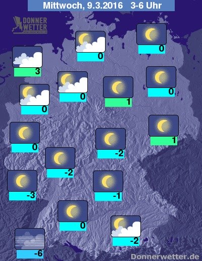 In der Nacht zum Mittwoch ziehen im Nordwesten und vor allem im Umfeld der Nordsee dichte Wolken durch, die jedoch keinen Regen bringen. Im äußeren Südosten halten sich ebenso oft dichte Wolken und es bleibt trocken. Im übringen Bundesgebiet ist es weitgehend sternenklar und dazu trocken. Die Temperatur sinkt auf 3 Grad an der Nordsee und bis -6 Grad im Markgräflerland.