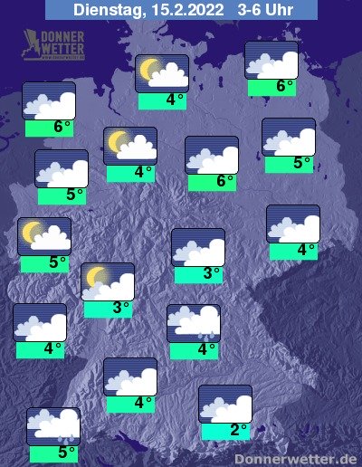 Am Dienstag bleibt es im Süden bedeckt, hier fällt gebietsweise Regen, an den Alpen Schnee. Sonst ist es zunächst teils aufgelockert, teils stark bewölkt, am Nachmittag setzt von Nordwesten her Regen ein. Die Temperatur steigt auf 4 Grad in München und bis 9 Grad in Rostock. Im Nordwesten weht zunehmend starker bis stürmischer Wind. An der Nordsee herrscht teils Sturm.