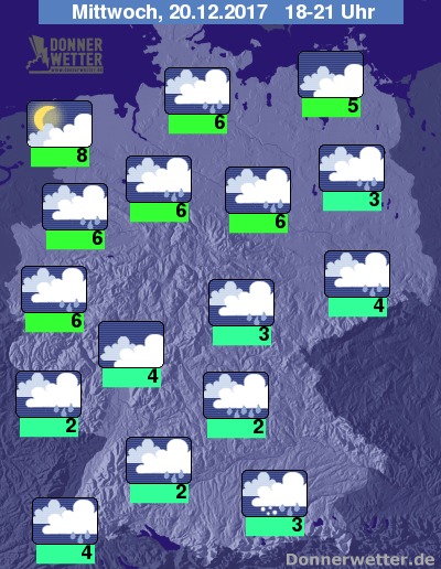 Heute Abend ist es im Nordseeumfeld meist aufgelockert bewölkt und trocken. In den anderen Landesteilen bleibt es hingegen verbreitet dicht bewölkt und es fällt zeitweise Regen oder Sprühregen, im Alpenvorland fällt oft auch Schneeregen oder Schnee. Die Temperatur liegt bei 2 bis 8 Grad.