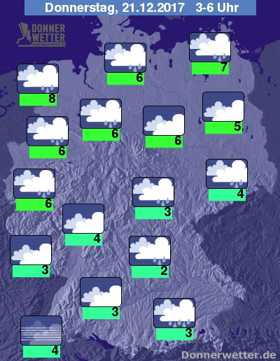 Am Donnerstag bleibt es praktisch landesweit bedeckt, dabei fällt immer wieder Regen, nur in Schleswig-Holstein und im Küstenumfeld bleibt es überwiegend trocken. Die Temperatur steigt auf mildere 5 bis 9 Grad.
